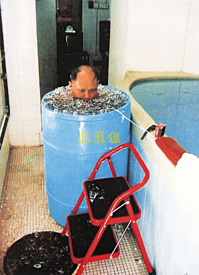 治療時,霍老要走進一個油桶中,桶中注滿冷水,待他整個人進入水中後再加入雪塊,浸浴一段時間後,再進入蒸氣房進行第2步治療。如此這般,20年來他每天都如此堅持進行。」