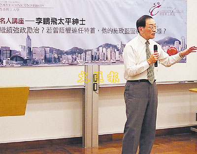 李鵬飛昨應邀出席香港理工大學及香港專上學院所設之講座,談及曾蔭權統治政策及連任後的施政藍圖。他表示,相信曾特首將會順利連任,「機會率達到百分之一百一十」,並認為特首連任後的當前要務是設法提升民望及建立統治班子,進行強政勵治。