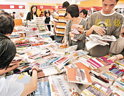 昨日不少書迷來到位於灣仔修頓球場的露天書展(下圖),書迷都樂於一邊享受秋風帶來的涼快,一邊陶醉於書海之中,極之寫意。但該書展雖然佔地寬廣,卻絲毫不見擠擁,反而另一邊廂 聚集了人群圍觀象棋對弈(上圖)。 本報記者潘達文 攝