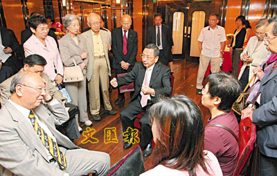 ■查懋聲(中)在香港各界文化促進會「名人面對面」活動上,分享自己的抗癌經驗,還即場教各人練氣功。本報記者曾慶威 攝