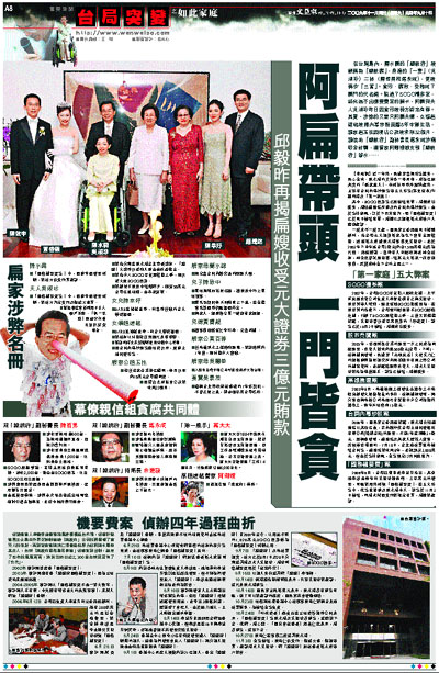 在台灣島內,陳水扁的「總統府」被戲稱為「總統腐」,身邊的「一妻」(吳淑珍)二秘(陳哲男和馬永成),更被稱作「三害」。貪污、腐敗、受賄成了扁門的代名詞。躲過了SOGO禮券案,終究逃不出機要費案的關卡,阿扁與夫人吳淑珍昨日因貪污被檢方認定有罪。其實,涉弊的又豈只阿扁夫婦,女婿趙建銘被揭內幕炒股面臨8年牢獄生活,親家趙玉柱因侵佔公款被求刑32個月,親信前「總統府」副秘書長馬永成涉嫌吸金詐騙,連管家阿卿嫂都支領「總統府」薪水……