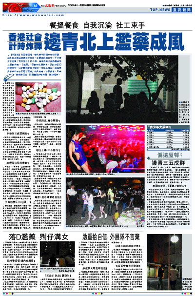 隨著警方加強打擊本地娛樂場所濫藥,青少年北上濫藥情況漸見普遍。根據禁毒處數字,今年上半年新增濫藥個案800多宗,超過20%都是居住在北區及大埔等接近內地社區。每逢周末,總有不少打扮時髦的少男少女聯群結隊,在落馬洲急急過關,到內地娛樂場所消遣,當然不少也會濫藥。去年中至今,就有135名青少年因為在內地濫藥被捕,經行政扣留後遣返本港。