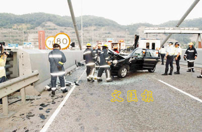【本報訊】一輛私家車沿青馬大橋行駛期間,疑因司機「行錯路」心急轉線,失控撞向路中石壆,凌空飛起翻側,滑行20米外方止去勢。車上5人均告受傷,其中司機重傷被困,由消防員救出送院留醫。其他4人包括兩名嬰兒,幸無大礙。