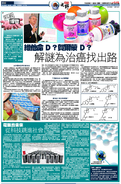 去年,幾名美國科學家在《美國公眾健康雜誌》(American Journal of Public Health)中發表報告,指出除了治療的功用,維他命D同時能幫助預防癌症。若每日攝取多於25毫克的維他命D,將有效減低50%患直腸癌,30%患乳癌和子宮癌的機會。