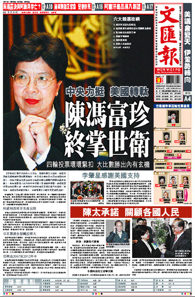 世衛前任總幹事李鍾鬱今年5月份突然病逝,世衛遂於6月1日開始推薦新總幹事候選人的工作,中國推薦本港前任衛生署署長陳馮富珍角逐該最高職位。過去3個月,陳太在中央政府全力支持,港澳特區政府全力協助下,開展了全方位拉票,並在短時間內走訪數十個國家。結果,她先在11月6日的第一輪初選中成功躋身5強,再勝出昨日的決戰。
