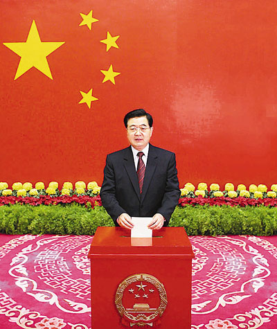 ■胡錦濤在北京市西城區中南海選區懷仁堂投票站投票。新華社