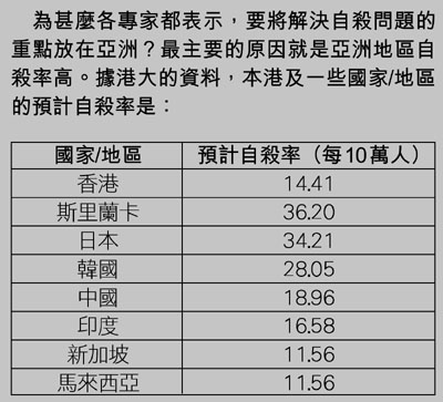為甚麼各專家都表示,要將解決自殺問題的重點放在亞洲?最主要的原因就是亞洲地區自殺率高。據港大的資料,本港及一些國家/地區的預計自殺率是: