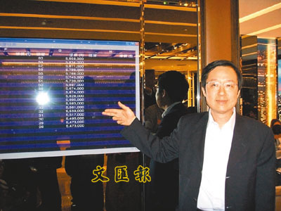 ■為顯示曼克頓山售樓透明度,新地代理執行董事雷霆於熒幕前展示價單。