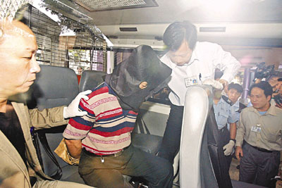 ■涉殺妻女3人的男戶主,被控以3項謀殺罪名。圖為他當日被捕後,由警員押走調查。
