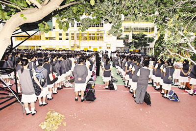 ■可立中學全校師生於昨晨早會舉行追悼會,悼念不幸遇害的莫麗源同學。