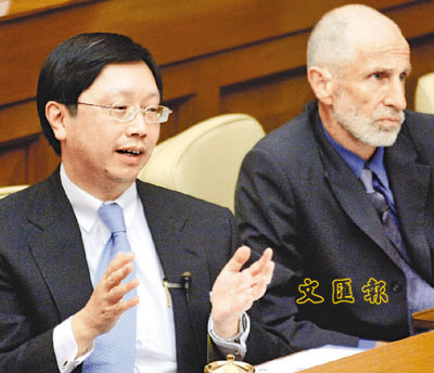 ■黃鴻超(左)昨日首次以教統局常任秘書長身份,在立法會就學券制「解畫」。旁為教統局副秘書長王啟思。 本報記者李志樑 攝