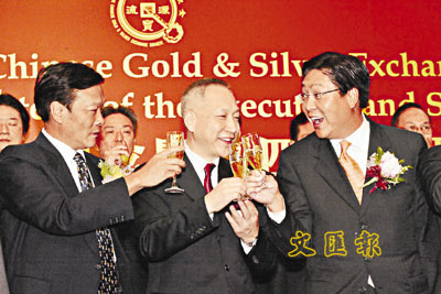 ■金銀業貿易場新一屆理事就職,財經事務及庫務局局長馬時亨(右)向理事長李德麟(中)祝賀。 本報記者張偉民 攝