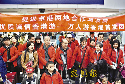 【本報北京新聞中心記者軼瑋、曾鄧晶14日電】由北京5大旅行社聯合組織的首個優質誠信香港旅遊團,今晨6點左右在北京國際機場出發。隨團的北京市旅遊局局長杜江表示,此次組團旨在淨化旅遊空氣,希望業界做出相應改善,稍後將與業界及旅行社商討,給旅遊熱點定出成本價,予消費者參考,從而自覺抵制低價團。