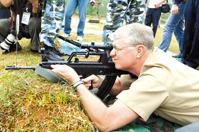 ■正在南海艦隊訪問的美國海軍太平洋艦隊司令拉夫黑德海軍上將,16日觀看了中國海軍陸戰隊隊員的軍事表演,並親自體驗射擊訓練。中新社