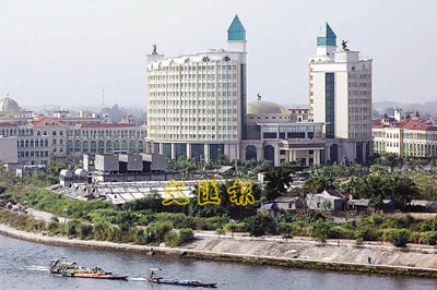 ■越南芒街的利來大酒店(圓頂建築)內曾經開設賭場,中國「封關」後,生意一落千丈,附近的鴻運大酒店(兩座尖頂建築)也遲遲不能開張。