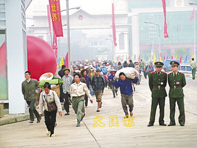 ■雲南河口口岸從事邊貿的商販穿流不息,一片興旺繁忙景象。