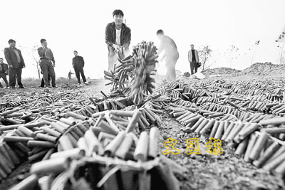 11月16日,工作人員進行鞭炮銷毀前的準備工作。 當日,河南省許昌市警方集中銷毀一批收繳的非法儲存、銷售、運輸的鞭炮。這批鞭炮的裝藥量、引信等指標不符合國家標準,爆炸威力大,極易造成人身傷害。 新華社
