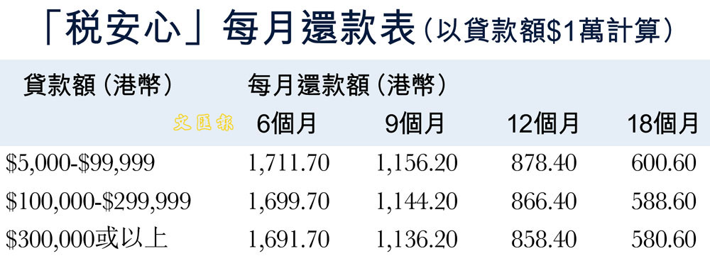 「交稅通」每月還款表(以貸款額每港幣$10,000計算) (圖)