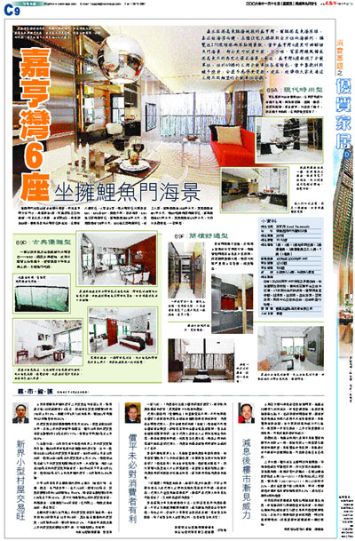 從西灣河地鐵站徒步走數分鐘後,即抵嘉亨灣大堂門口,乘電梯往1樓,穿過屋苑各座的通道,海景已盡入眼簾。走到第6座,乘電梯往69樓,便是新設的示範單位所在地。全層有八個單位,A室至H室,而示範單位分別設於69A、69D及69F,面積不同,設計相異。69A為三房兩廳單位,建築面積為934平方呎,實用面積有728平方呎﹔69D為三房兩廳單位,有工人房,建築面積為1030平方呎,實用面積有801平方呎﹔而69F則是兩房兩廳單位,建築面積為672平方呎,實用面積有526平方呎,大部分景觀開揚,一望無際。