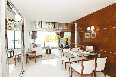 一間以深啡色及白色配搭的示範單位——69D,感覺古典優雅。於部分牆壁上加添鏡子,使整間屋子平添古典之餘,又帶點時代感。