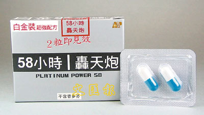 ■衛生署籲市民,不要購買及服食六種可能引致副作用的健康產品。圖為「白金裝超強配方58小時轟天炮」。