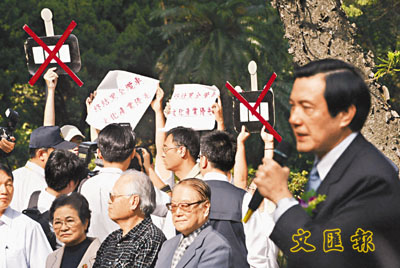 ■台北市長馬英九 (前右)昨日在台北市立圖書館北投分館開幕典禮致詞時,綠黨市議員候選人張聿文帶領人馬前往表達訴求。 中央社