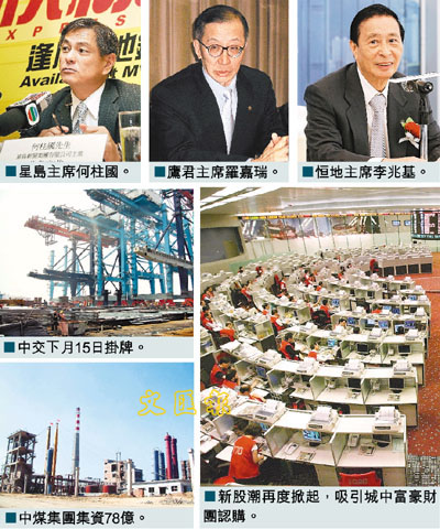 要數今次集資潮的重頭戲,非國資委轄下的央企中國交通建設(中交)莫屬。中交原先計劃以A、H股同步上市,後改為「先H後A」,發行35億股H股,佔總股本25%,其中5%作公開認購,95%為國際配售,集資額約達156億元。初步計劃本月28日開始國際配售,下月1至6日公開招股,下月15日掛牌,保薦人為中銀國際、瑞銀及美林。