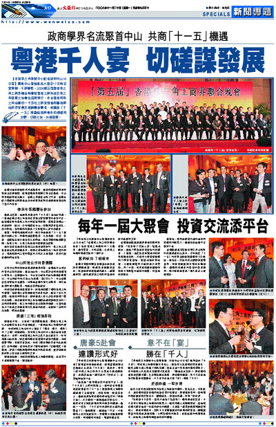 【本報珠三角新聞中心記者胡明中山18日電】廣東中山香格里拉大酒店17日晚百宴齊開,千商會聚。2006第五屆香港珠三角工商界聯合晚會暨香港工商科技及珠三角發展交流會在這裡舉行,來自香港和珠三角地區的一千多位工商業領袖和粵港兩地政府官員及相關專家學者,就國家「十一五」規劃給港商帶來的機遇和挑戰,切磋交流,共謀發展。