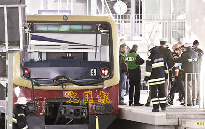 德國首都柏林一城市鐵路樞紐站昨日上午發生撞車事故,一列載客火車撞上一輛維修工程車,造成客車上33人受傷,工程人員在現場檢查。 路透社/新華社