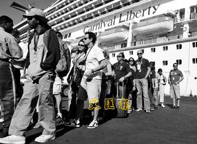 ■自由號郵輪的乘客在佛羅里達州陸續下船,眾人皆面露倦容。 法新社
