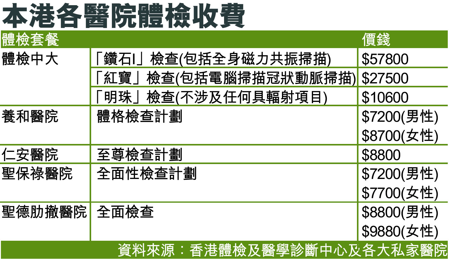 本港各醫院體檢收費 (圖)