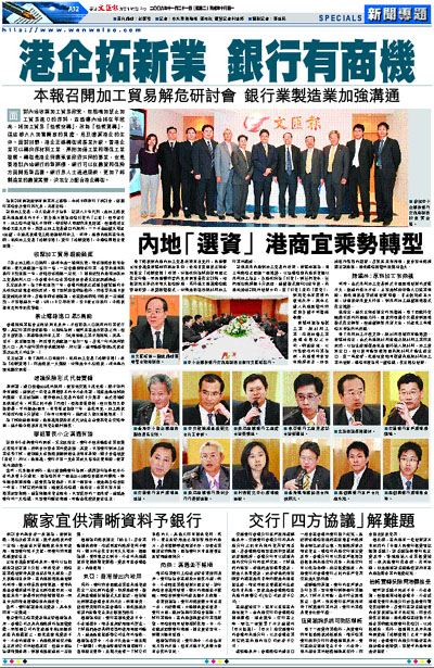 面對內地收緊加工貿易政策,包括增加禁止加工貿易進口的原料,並盛傳內地將在年底前,將加工貿易「檯帳空轉」,改為「檯帳實轉」,這些都大大加重廠家的負擔,危及逾萬港企的生存。面對挑戰,港企正謀轉型或產業升級。香港企業可以轉向原材料工業、高附加值工業和環保工業發展。轉型是港企與廣東省政府共同的事業,也是香港駐內地銀行的新商機,銀行可以在融資和保險方面開拓新品種。銀行界人士通過座談,更加了解製造業的融資需要,決定全力配合港企轉型。