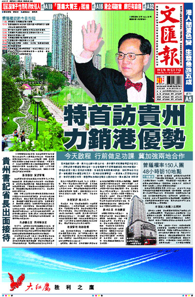 同時,曾特首一行的午、晚膳安排都設在官辦賓館,故該酒店只需安排其兩天的早餐用膳,而酒店方面則有意安排加入4款本地特色菜讓特首小嘗,但貴州菜以酸辣為主,酒店會減輕酸辣用量。而考慮到特首一行習慣讀閱港報,應貴州方面要求,本報將成為一份送入訪問團入住房間的港報。 ■本報貴州報道組