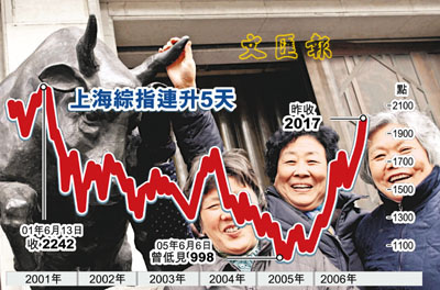2006年是內地股改取得重大進展的年頭,也是內地股市的大轉折年,上海A股綜合指數由1000點附近徘徊,到一路向上越過重重關口,昨日更突破2000點,以2017點收市,創5年新高。上證所截至11月17日總市值已達50912.82億元人民幣(下同),比去年底增加120%,總流通市值12572.44億元,也較去年底增加一倍多。隨著大部分公司股權分置改革完成,解決了困擾多年的頑疾;加上中國銀行、工商銀行等大藍籌紛紛上市,A股市場一改多年頹氣,指數已較去年6月股改實施時的最低998點翻番。中國股市已經擺脫長達四年的「迢迢熊途」,踏入牛市。 本報記者 陳曉曄 上海新聞中心實習記者 趙錚
