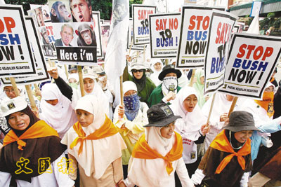 印尼10個城市昨日都有反美示威,茂物有近一萬名示威者,當局派出約600名警員維持秩序,示威者高舉「布什是恐怖分子」的標語,又有人帶同展示伊拉克和巴勒斯坦人民苦況的海報到場抗議,高呼「真主偉大」。期間有50名學生試圖衝破警方的防線,並與警員推撞,最終被驅趕。另外有兩個城市的反美學生企圖圍堵麥當勞和必勝客等美資快餐店。