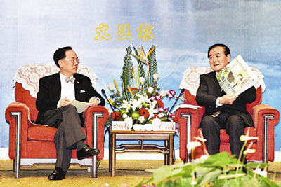 ■貴州省委書記石宗源(右)拿出《文匯報》,引證曾蔭權很關心貴州發展。
