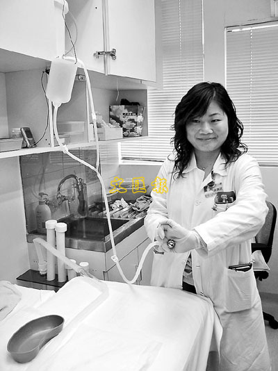■港大正研究洗腸能否紓緩嚴重便秘問題。圖中的姑娘拿著洗腸使用的喉管。 本報記者李見安 攝