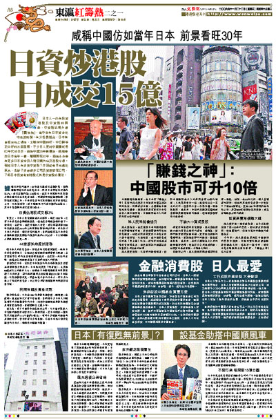日本人一向有投資港股及中資股的興趣,中資股近期升得「恰恰」,當中也有日本資金從中推波助瀾。有分析員指出,日本新首相安倍上場後,主動與中國修好,中日關係正向好的方面發展,不少日人更將中國看成是60年代的日本,認為中國08年奧運後,經濟會如日本當年一樣,繼續興旺30年,相信未來會有更多日本資金投入到中國內地及港股市場。到底日本人有多愛中資股?本報記者早前遠赴東京,走訪了多家證券公司及資產管理公司,了解日本投資者對港股尤其是中資股的看法。