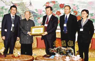 ■張國良(中)代表香港新聞界高層訪澳團向馬萬祺(左二)致送紀念品,旁為葉啟榮(左一)、周慶(右二)及魯薇(右一)。