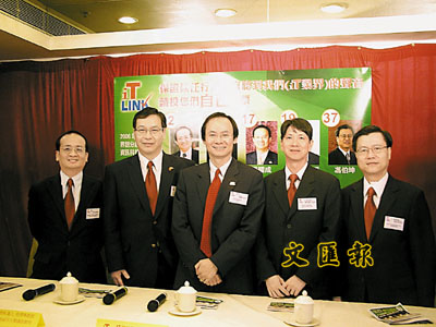■(左起)馬志強、容啟寧、張耀成、陳永福及馮伯坤五人組成「iTLink」,參選選舉委員會資訊科技界別分組選舉。本報記者譚可盈 攝