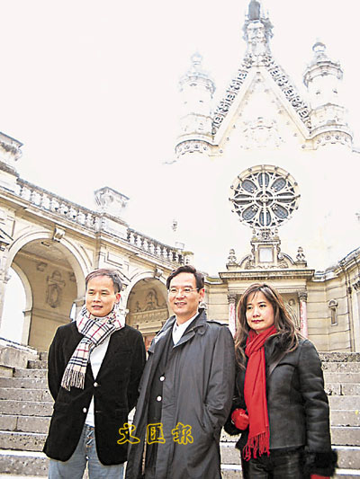 ■恆地營業部總經理謝偉銓(中)、副總經理林達民(左)及鄧鳳賢在香堤邑城堡的廣告拍攝現場合攝。本報記者周紹基 攝