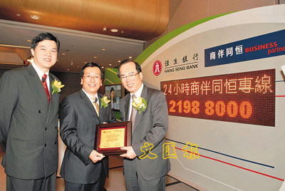 恆生銀行副董事長兼行政總裁柯清輝(右)、恆生銀行助理總經理兼商務理財業務主管徐振文(左)等出席24小時「商伴同恆專線」的推展儀式。