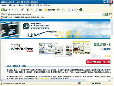 有見及此,CEPA 業務發展中心推出嶄新的「CEPA WebBuilder 網上產品通」服務,中小企可迅速為自己公司建立一個網上產品展覽館,向內地及全球市場展示公司產品資料。WebBuilder特色包括可隨時更改產品資料及網頁內容,毋須特別技巧;並可支援兩層產品分類架構資料庫, 展示不限數目的產品。網站並連結至CEPA業務發展中心(www.cepachina.net)的網站,以加強這網上展館在內地市場的推廣效用。