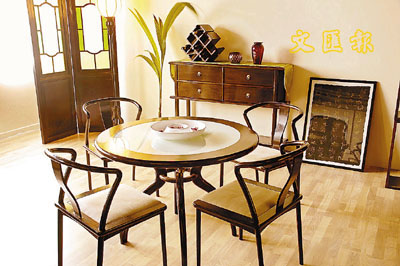 ■另一邊廂,飯廳中,一張實木圓桌加四張桌子,桌子以榆木製造,可以較輕易推開椅子呢!