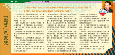 全桌人先啞然,後失笑;那說話的腔調,全是學自他的老爸!他媽媽想用手堵住他的小嘴,也來之不及。尷尬之下,有人以「孩子真聰明」打圓場,過後卻背地裡批評:「現在的孩子,真是惹不起!」