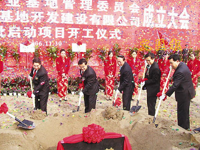 ■陝西省代省長袁純清(左一)與西安市領導為基地奠基。 本報西安傳真