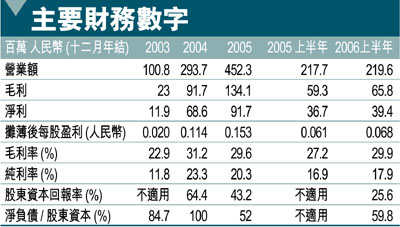 營業額由2003年的1億元人民幣升至去年的4.52元人民幣,複合增長達110%,令盈利三年間由1200萬急升至9200萬。