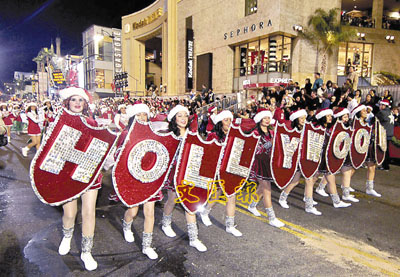 ■日前,在美國加利福尼亞州荷里活市,第75屆荷里活聖誕大遊行在該市的荷里活大道和日落大道舉行。圖為荷里活高中的遊行隊伍從荷里活大道的柯達劇院門前經過。 新華社