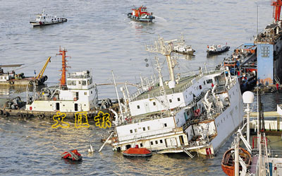 據上海電視台報道,在南浦大橋靠浦東一側附近的江面上,一艘萬噸輪露出水面的白色船艙、煙囪和指揮塔,從海事局趕來的5艘清污船和二艘拖輪正在進行打撈沉船。
