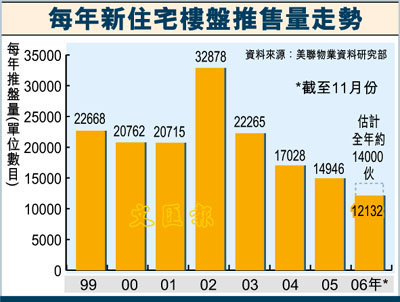 劉嘉輝表示,今年新盤推盤量減少,首11月份僅得10,669宗一手私人住宅註冊登記,估計全年亦只有12,000宗左右,較05年全年15,071宗進一步下滑,並創自96年有紀錄以來新低。